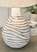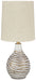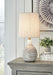 Shine a contemporary spotlight on your good taste with this table lamp. The antiqued white and goldtone finish of its base adds texture and interest to any space. With a modified drum shade, this light will illuminate your decor with style.