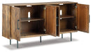 Storage options abound with this accent cabinet featuring 4 chevron pattern doors accented by long dark gray finished metal door pulls. Store dinnerware, cookbooks and many other options within the sideboard which features 2 fixed shelves. The light brown finish will complement virtually any room decor.
