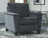 Covered in an upholstery loaded with plush texture, this less-is-more contemporary chair is dressed to impress with angled side profiling and track armrests wrapped with a layer of pillowy softness for that little something extra. Talk about one sensational look.